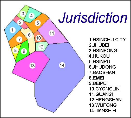 1. Hsinchu City: divided into the Eastern, Northern and Hsiangshan districts, covering an area of 104.1 sq. km., As of the end of May 2025, the population is 455,905. 2. Hsinchu County: includes 13 rural and urban townships and cities (Chupei City, Kuantu, Hsinpu, and Chutung urban townships, and Hsinfeng, Hukou, Peipu, Paoshan, Omei, Chiunglin, Hengshan, Wufeng and Chienshih rural townships), covering an area of 1,427.6 sq. km., and , with a population of 596,776 as of the end of May 2025. Special features of the area under the office's jurisdiction: The jurisdictional area of this office includes Hsinchu County and City. It is a vast region with mountains and hills. Hsinchu City, located on the flat land, is the main metropolis. The other townships and cities are distributed along the western seaboard and in the hill and valley areas in the east. Residents are mostly engaged in agriculture, forestry and fishing; it is mainly an agricultural society. Compared to the metropolitan areas, the area is safer. In addition to a minority of indigenous people , the main ethnic group is the Hakka. Of the remainder, the Minnan people are the majority. Residents are thrifty, hardworking, and law-abiding; therefore, there are few major criminal cases. The Hsinchu Science-Based Industrial Park has developed rapidly in recent years. The Industrial Technology Research Institute, National Tsinghua University, National Chiao Tung University, Chunghwa University, Hsuan Chuang University, Minghsin Institute of Technology, and Ta Hwa Institute of Technology are within the office's jurisdiction. Their equipment and resources are complementary, and they benefit from association with each other, building the area into a city of technology.